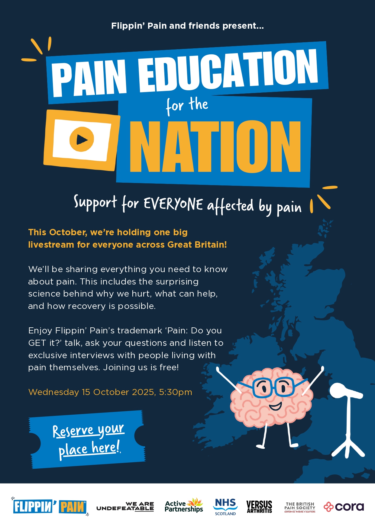 Save the date! Wednesday 15th October. From 5:30pm-7:30pm, Flippin' Pain and friends present Pain Education for the Nation, an online, free event for anyone affected by persistent pain, live-streaming across Great Britain.