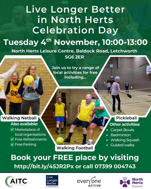 Join us on Tuesday 4th November for an exciting Live Longer Better in North Hertfordshire event! Focusing on helping you find physical activities you enjoy to help you live longer better. This event will be delivered by Active In The Community, North Herts Council and Everyone Active.