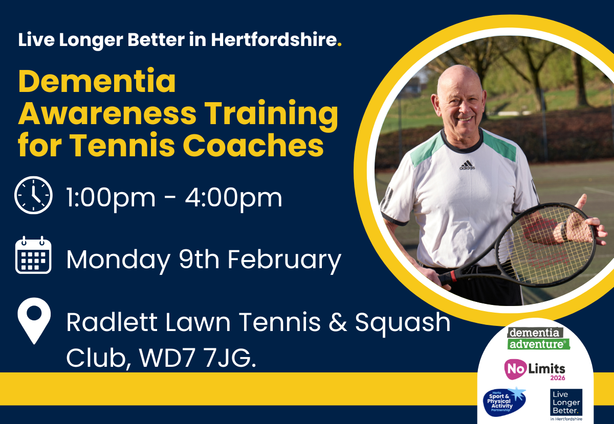 Dementia Adventure is delivering a free, in-person training designed specifically for Hertfordshire tennis coaches, officials, and volunteers. Fully funded by Herts Sport & Physical Activity Partnership and Live Longer Better in Hertfordshire, and delivered in support of the #NoLimits2026 campaign, this course offers practical learning that will make a real difference on and off the court.