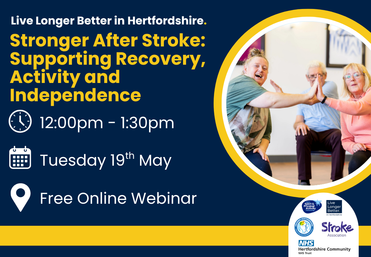 This May, in recognition of Stroke Awareness Month, Live Longer Better in Hertfordshire invites you to join a dedicated and insightful webinar focused on improving support for stroke survivors, as well as those who care for and work alongside them. Delivered in partnership with the Stroke Association, Headway Hertfordshire and expert insight from an NHS Community Neuro Physiotherapist, this session brings together leading voices to inform, educate and empower attendees.